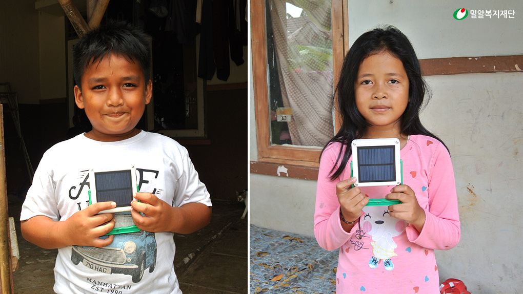도시 외곽에 위치한 인도네시아 까두시룽 마을은 전기 공급이 열악했습니다. 마을 주민 대부분이 힘겹게 생계를 이어나가고 있으며, 비가 많이 오는 날에는 전기가 끊겨 마을주민과 아이들 모두 불안에 떨어야 했습니다. 그리고 마을 근처에 많은 학교들이 밀집해 있지만, 학교도 마찬가지로 전기가 잘 공급되지 않았습니다. 밀알복지재단은 까두시룽 마을을 포함한 근처 초등학교를 대상으로 태양광랜턴을 약 1,000개 전달했으며, 랜턴을 지원받은 아이들은 전기가 끊겼을 때에도 공부나 숙제를 할 수 있다며 기뻐했습니다.