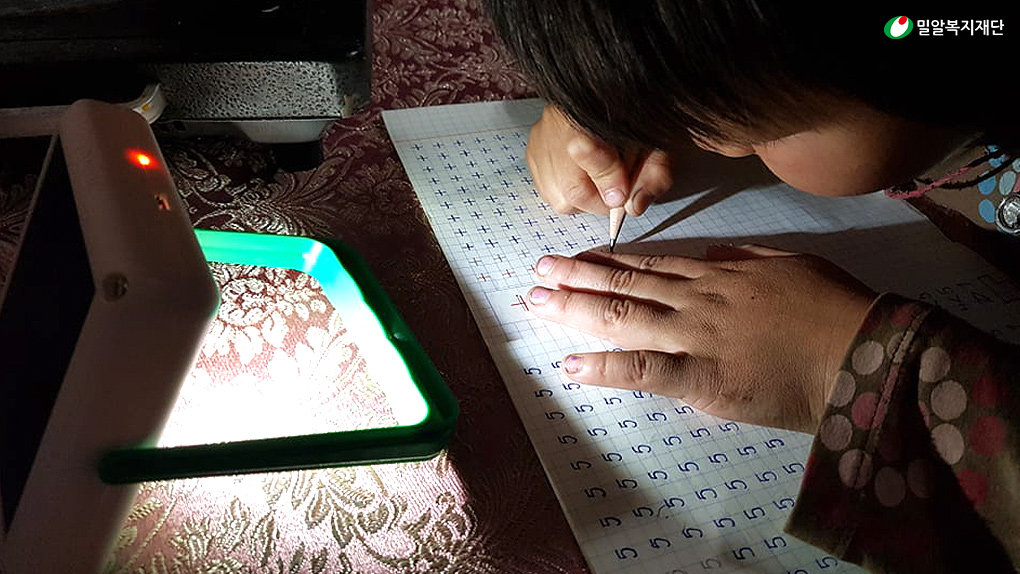 태양광랜턴으로 공부하고 있는 몽골 아동