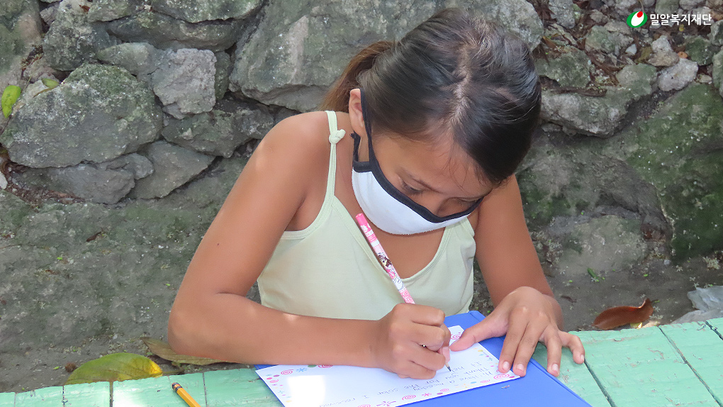 태양광랜턴을 배분받은 한 세부 아동은 낮에는 시각장애가 있는 어머님과 동생들을 돌보기 때문에 학업을 할 수 없었습니다. 그래서 어머님과 동생이 잠든 밤 시간에 태양광랜턴으로 공부를 하기 시작했습니다. 아동은 집에서 뿐만 아니라 학교에서도 태양광랜턴을 들고 다니며 수업에 열심히 참여했습니다. 그리고 태양광랜턴을 선물해준 밀알복지재단 후원자들에게 감사 편지를 보내주었습니다.