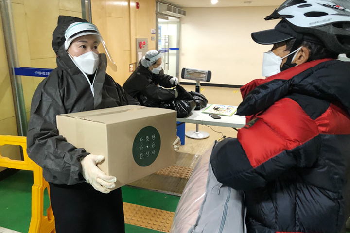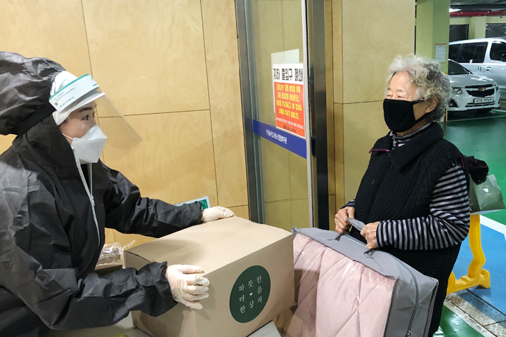 ‘따뜻한 마음 한 상자’에는 밥과 국, 반찬, 누룽지 등의 간편식품이 담겨있습니다. 그리고 위생관리에 필요한 마스크와 치약 칫솔과 함께 포근한 겨울밤을 보내실 수 있는 토퍼 등을 더했습니다. 코로나19로 자유롭게 외출할 수도 없었고, 누구 하나 챙겨주는 이도 없으셨던 어르신들께 따뜻한 마음 한 상자는 오랜만에 느끼는, 우리 이웃들의 훈훈한 정이었습니다.