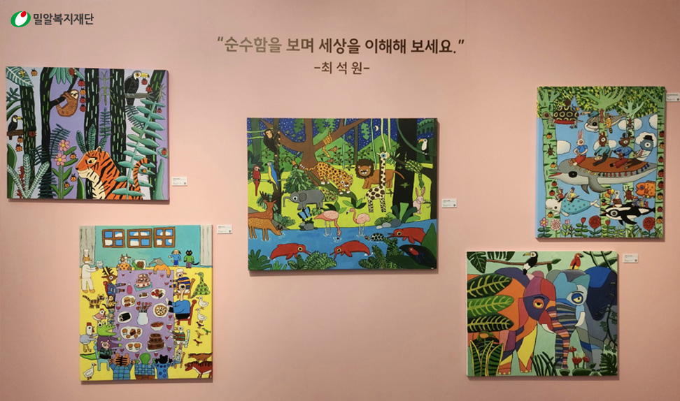 한편, 브릿지온 아르떼 최석원 작가는 처음으로 외부 전시회에 단독으로 참여했습니다. 7월 22일부터 9월 10일까지 예술의 전당 한가람미술관에서 진행된 <렛츠플레이아트전>에서 7개 작품을 전시했습니다. 최석원 작가는 작품을 통해 동물나라에 빗대어 꿈꿔왔던 장애인과 비장애인 간의 차별 없는 세상을 보여주며 대중에게 발달장애인 최석원이 아닌, 예술가 최석원으로 당당히 설 수 있었습니다.