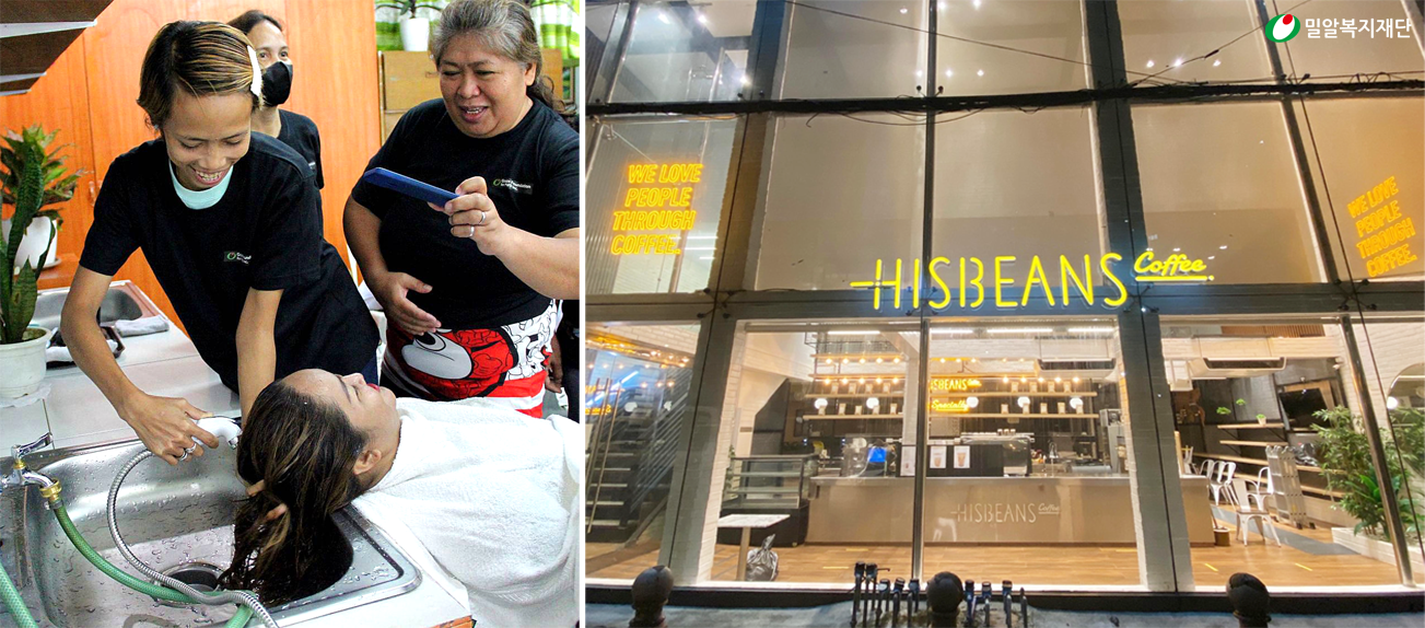 또한, 필리핀 퀘존에서는 장애인 일터 ‘히즈빈스 카페’를 운영하고 있습니다. 장애인 바리스타와 함께하는 히즈빈스 퀘존점은 히즈빈스 카페의 첫 해외 지점으로, 필리핀 현지에서도 장애인 일자리 창출의 좋은 사례로 소개되고 있습니다.