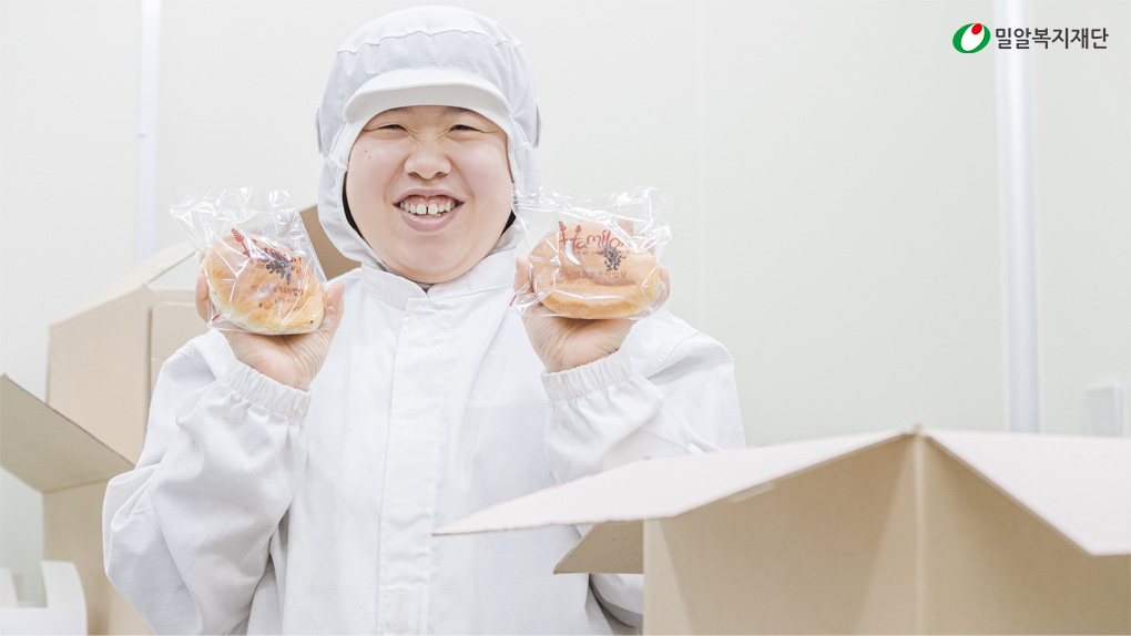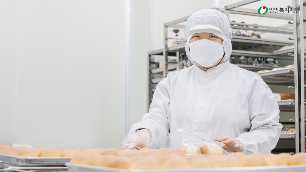 현재 저는 제과제빵의 일부 공정에 참여해 빵을 생산하는 것은 물론, 직업훈련교사 선생님을 도와 장애인 훈련생들에게 간단한 작업을 가르치는 역할도 맡고 있습니다.