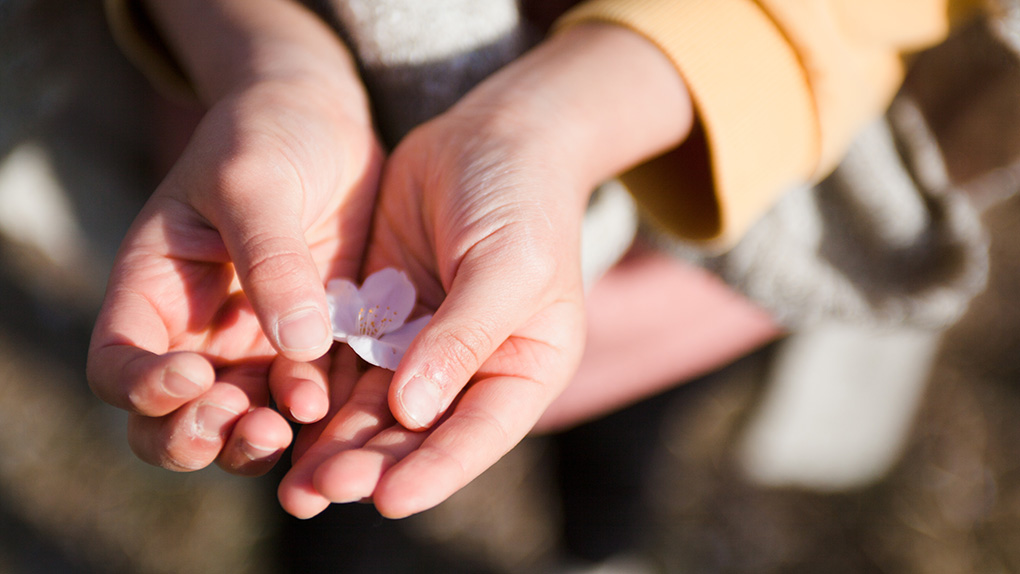 장애 아동들에게 벚꽃잎을 쥐여주세요.