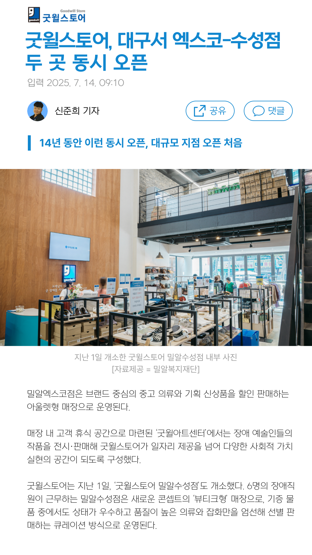 저는 실제로 다음 취재 때 굿윌스토어에 방문해서 직접 봉사활동을 해보기로 했어요. 굿윌스토어에 기부되는 물품들에 각기 다른 사연이 있을 텐데 다양하고 감동적인 기부 사연에 대해 취재해 보려 합니다! 그리고 밀알복지재단에서 어떻게 자립 청소년이나 위기가정을 지원하고 있는지, 어떤 지원을 하고 있는지도 기사로 다뤄보고 싶네요.