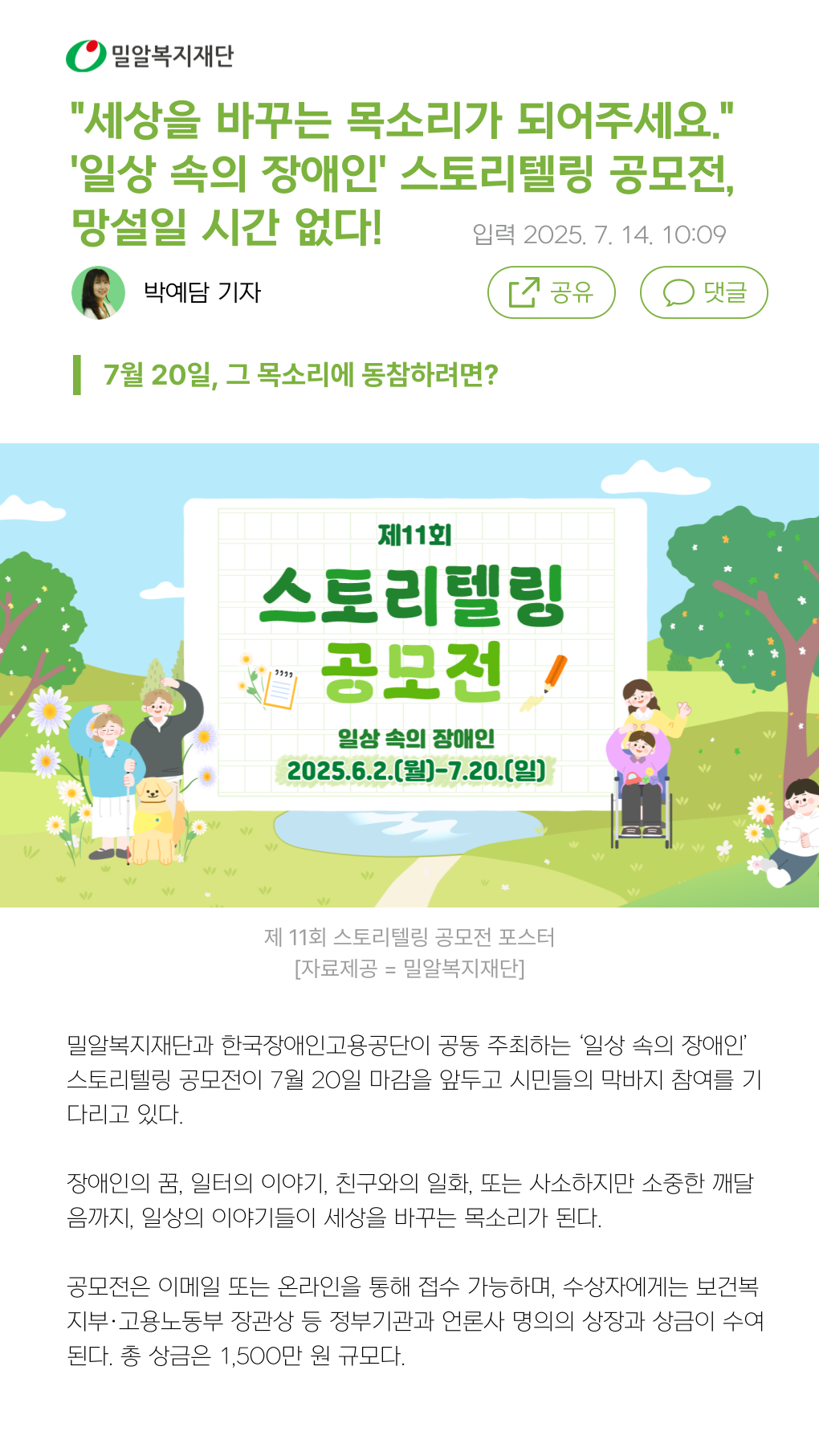안녕하세요. 밀알복지재단 대학생 기자단 박예담입니다. 이화여자대학교에서 통계학을 공부하고 있지만 평소 국내 위기가정이나 구호활동에 관심이 많아 밀알복지재단 대학생 기자단에 지원했고 올해6기로 기자단 활동을 이어가고 있습니다.