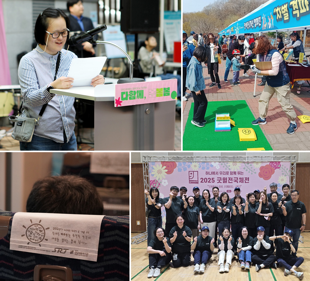 성남시장애인권리증진센터는 율동공원에서 퀴즈와 체험으로 장애 인식 개선 캠페인을 열었고, 성남시한마음복지관은 공연·전시·부스활동 등으로 다채로운 행사를 진행했습니다. 강남세움복지관은 참여자와 지역주민이 함께 만든 작품을 SRT 열차에 SR(주식회사 에스알)과 함께 캠페인을 펼쳤고, 굿윌스토어 밀알구리·공릉점은 굿윌전국체전에 전 직원이 참가해 열띤 하루를 보냈습니다.