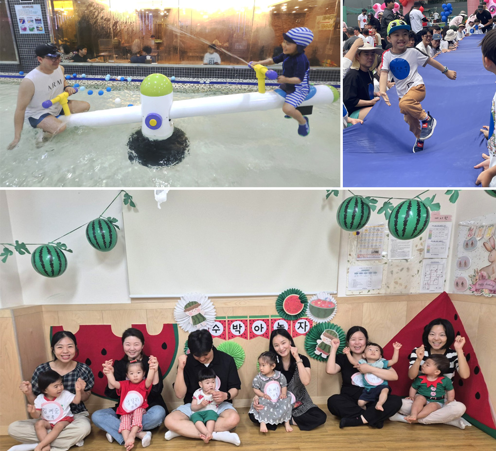 목련어린이집은 실내수영장에서 부모와 함께 물놀이하며 즐거운 추억을 만들었고, 부암어린이집은 가족 운동회로 웃음 가득한 하루를 보냈습니다. 청마을어린이집은 수박을 이용한 신체놀이로 부모와 따뜻한 시간을 보냈습니다.