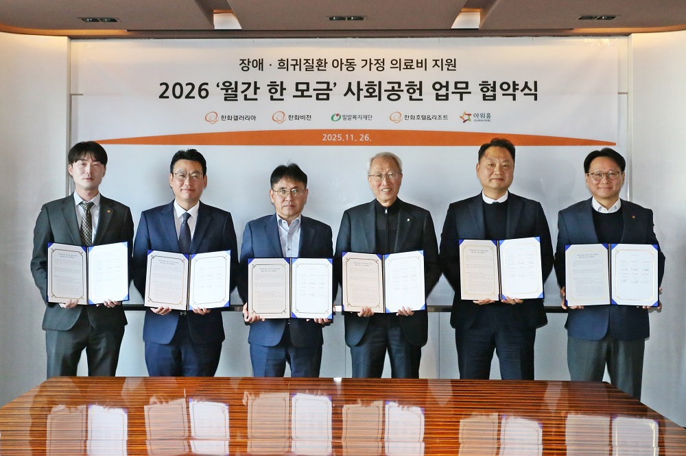 한화갤러리아, 한화호텔앤드리조트, 한화비전, 아워홈 4개사는 지난 11월 26일(수) 서울 더 플라자에서 밀알복지재단과 업무협약(MOU)을 체결하고, 저소득 장애·희귀질환 아동 가정의 의료비 지원을 위한 ‘2026 월간 한 모금’ 기부금 2억원을 전달했습니다.