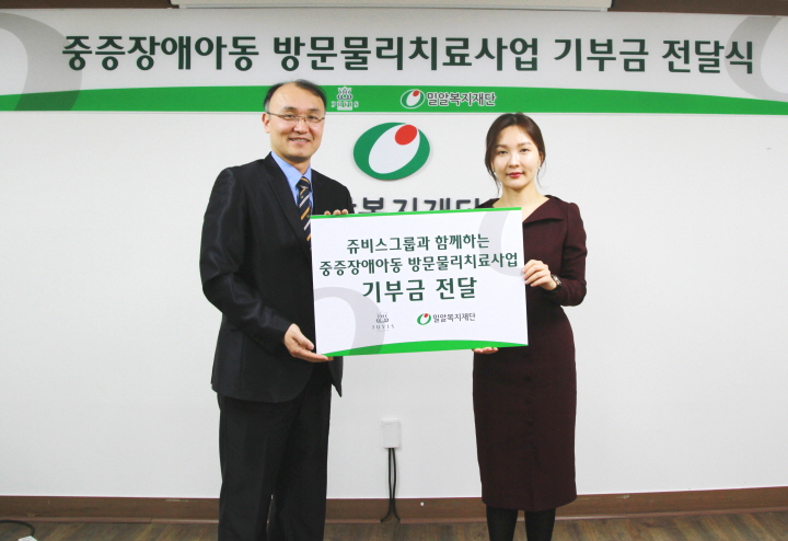 쥬비스그룹, 밀알복지재단에 중증장애아동 방문물리치료지원을 위한 기부금전달