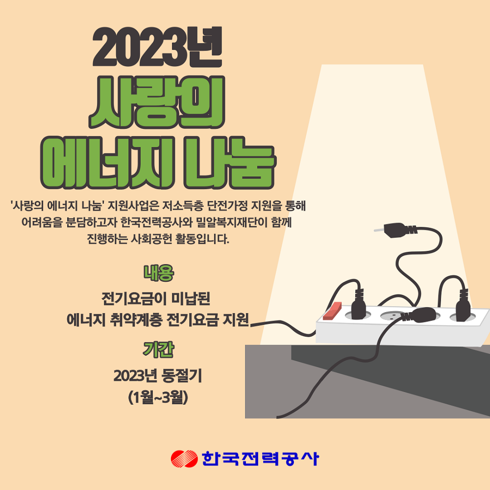 한국전력공사는 연간 약 5,000억원의 전기요금 복지할인을 시행하고 있지만 사각지대에 있는 에너지 취약계층을 지원하기 위해 한국전력공사의 대표 사회공헌사업인 사랑의 에너지 나눔지원사업을 2003년부터 21년째 진행하고 있습니다.