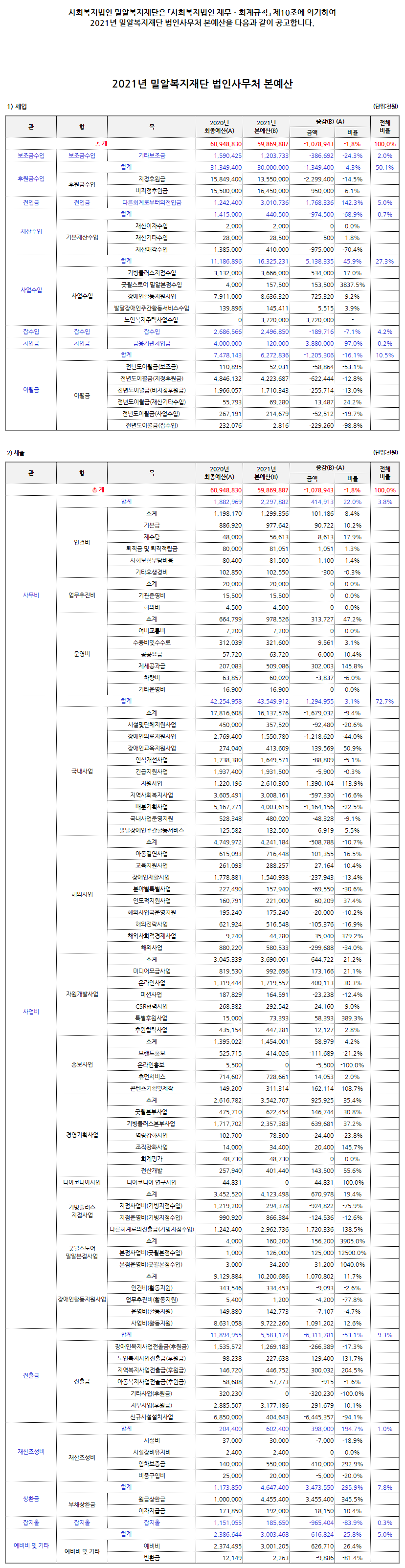 2021년 밀알복지재단 법인사무처 본예산 공고