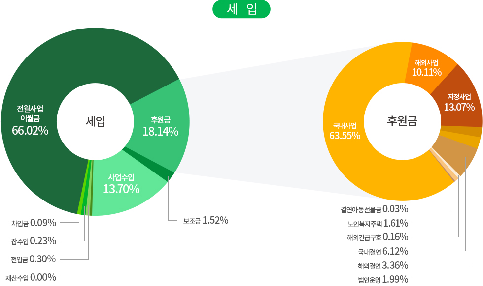 | 사업비 | 국내사업 | 국내아동결연 및 보육, 장애인의료 및 교육지원, 저소득가정지원, 다문화가족지원, 노인복지사업, 지역사회복지사업, 인식개선사업, 발달장애인주간활동서비스 |