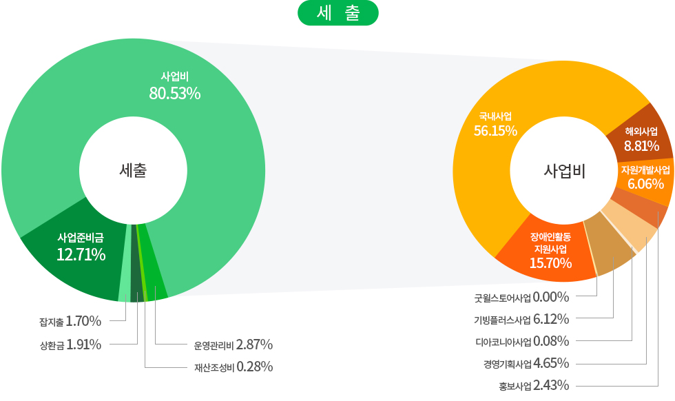 | 사업비 | 국내사업 | 국내아동결연 및 보육, 장애인의료 및 교육지원, 저소득가정지원, 다문화가족지원, 노인복지사업, 지역사회복지사업, 인식개선사업, 발달장애인주간활동서비스 |