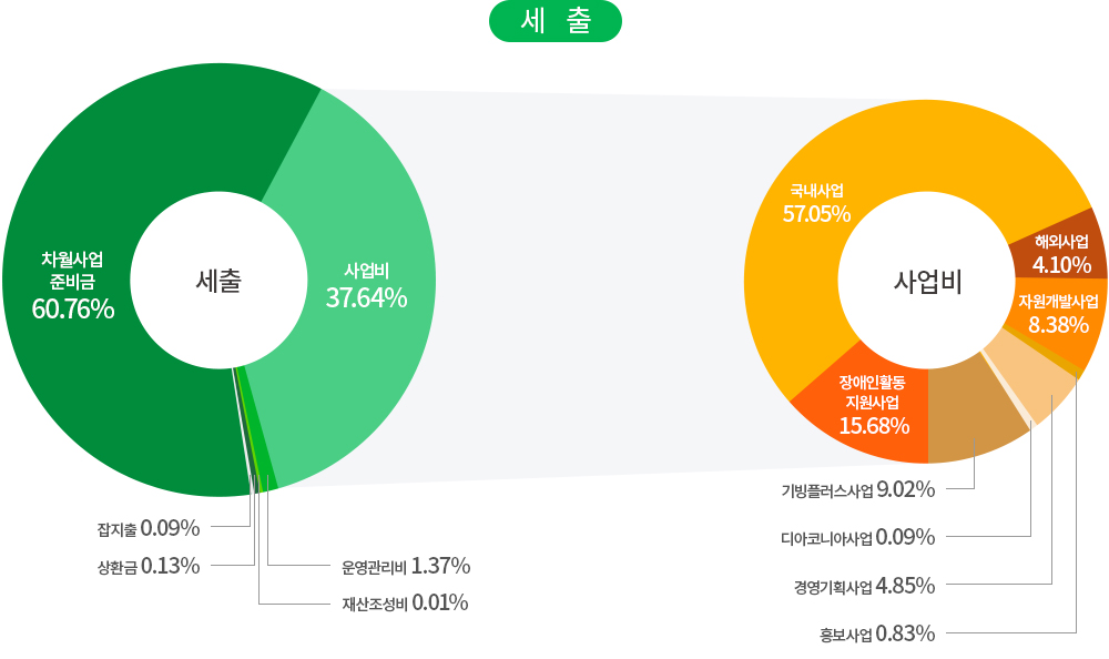 | 사업비 | 국내사업 | 국내아동결연 및 보육, 장애인의료 및 교육지원, 저소득가정지원, 다문화가족지원, 노인복지사업, 지역사회복지사업, 인식개선사업, 발달장애인주간활동서비스 |