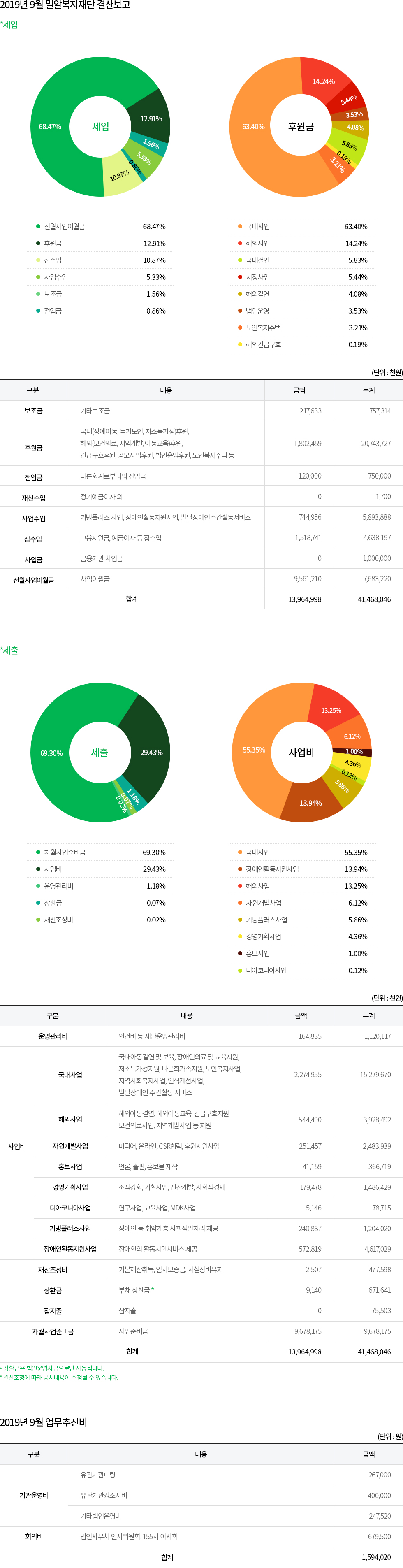 2019년 9월 밀알복지재단 법인사무처 결산보고 및 업무추진비 공개