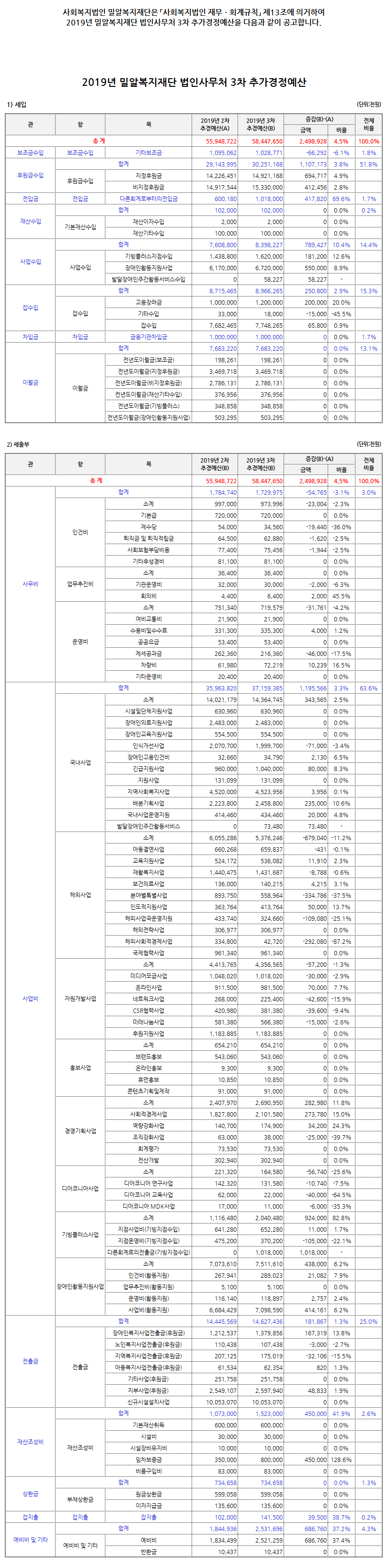 2019년 밀알복지재단 법인사무처 3차 추가경정예산 공고