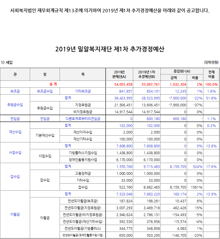 2019년 2월 밀알복지재단 법인사무처 결산보고 및 업무추진비 공개