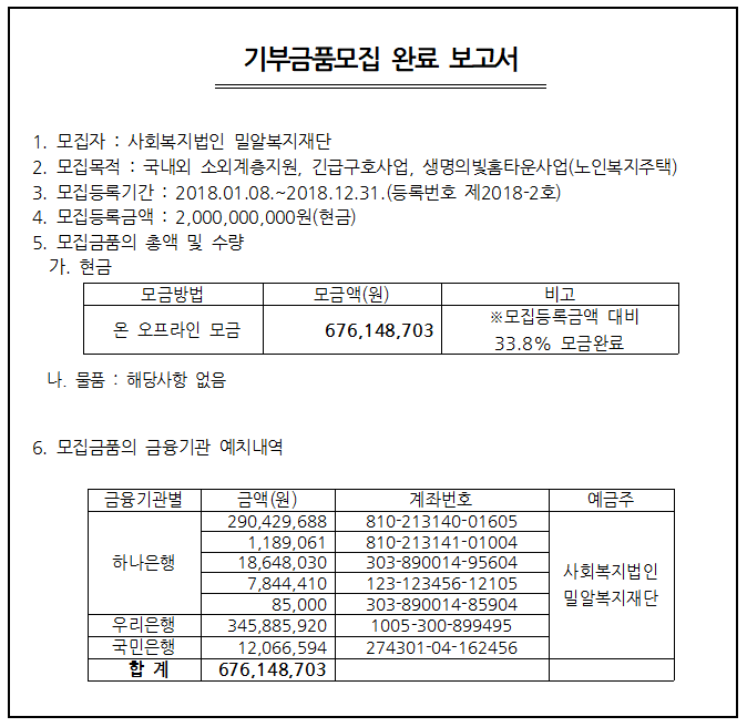 아래와 같이 기부금품을 모집하여 완료 보고합니다.