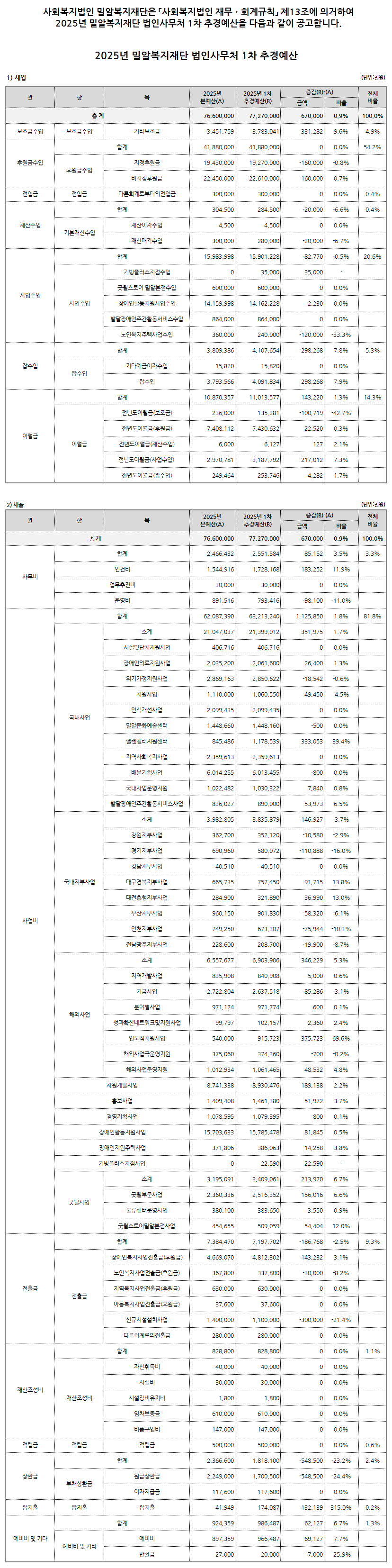 2025년 밀알복지재단 법인사무처 1차 추가경정예산 공고