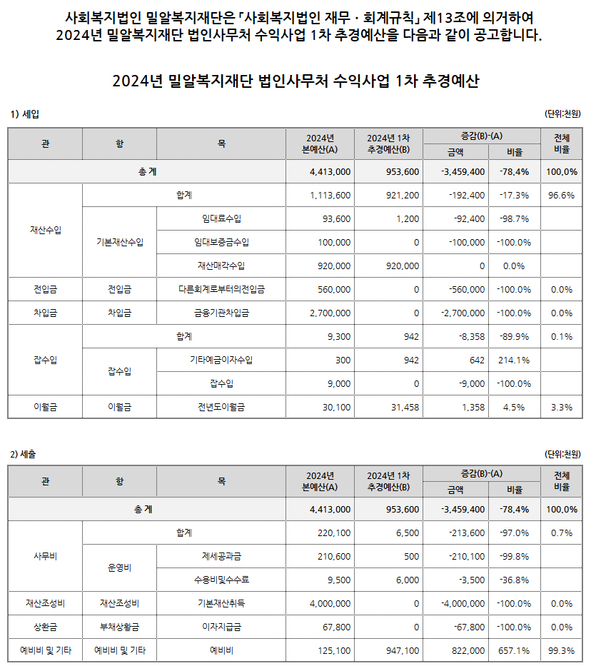 2024년 밀알복지재단 법인사무처 수익사업 1차 추가경정예산 공고