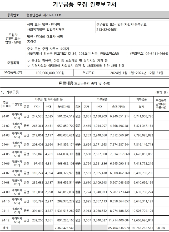 제14조 및 같은 법 시행령 제19조 제6항에 따라 2024년 기부금품 모집을 완료하고 다음과 같이 공개합니다.