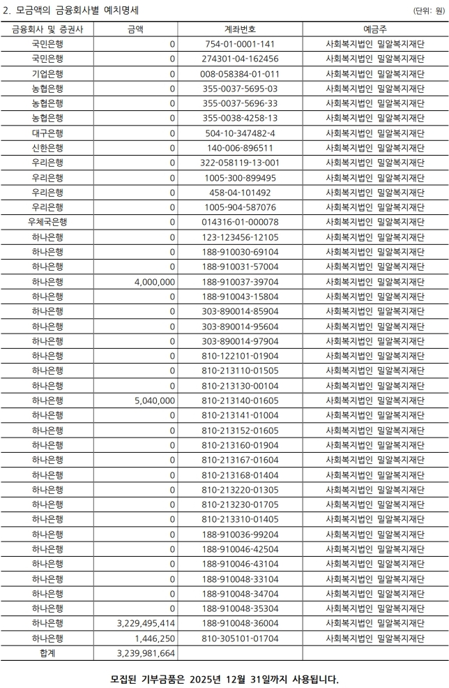 사회복지법인 밀알복지재단은 「기부금품의 모집ㆍ사용 및 기부문화 활성화에 관한 법률」