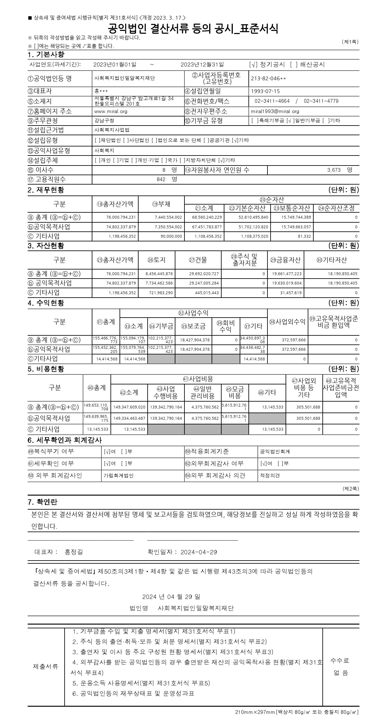 2023년도  「공익법인 결산서류 등」 의 공시를 보고합니다.
