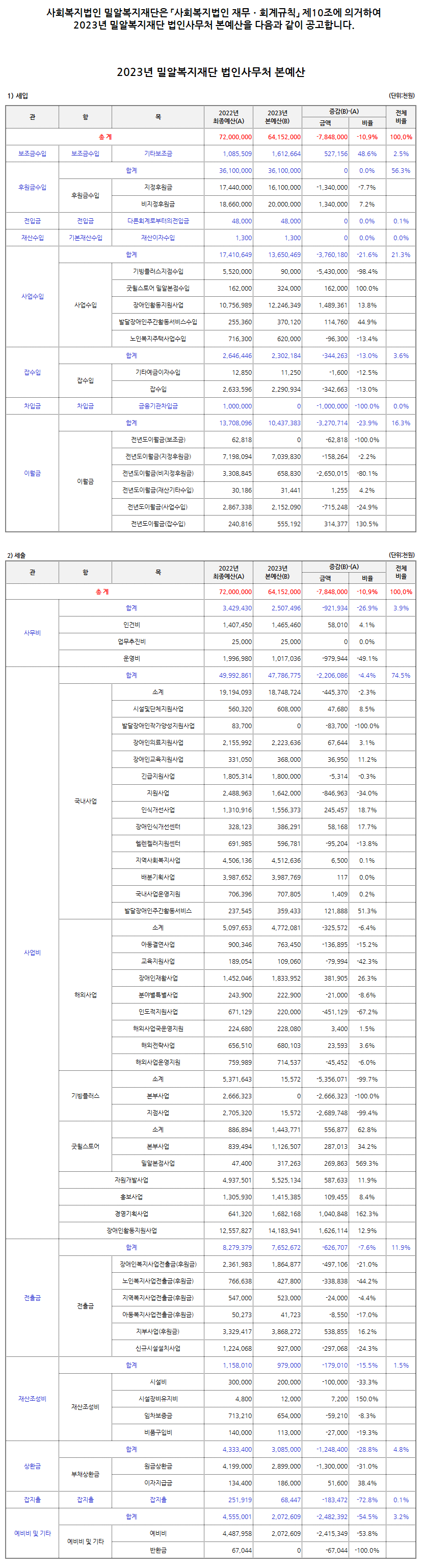 2023년 밀알복지재단 법인사무처 본예산 공고