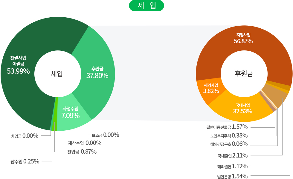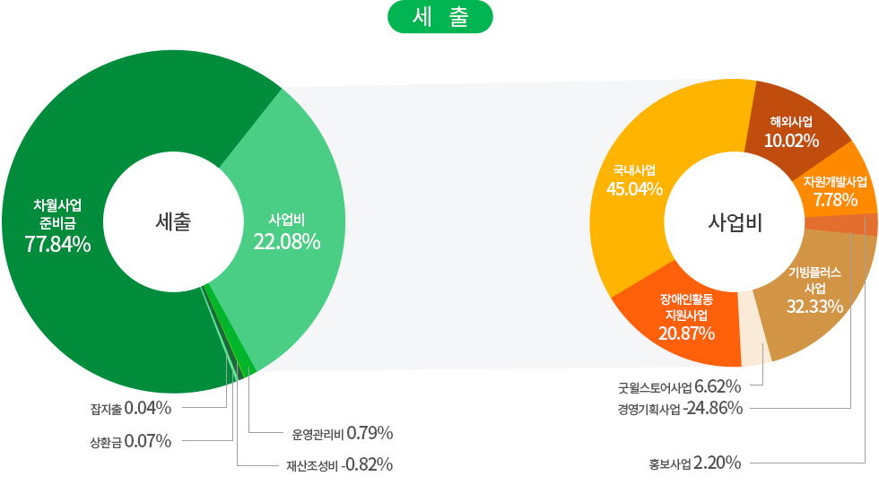 | 사업비 | 국내사업 | 국내아동결연 및 보육, 장애인의료 및 교육지원, 저소득가정 지원, 다문화가족 지원, 노인복지 사업, 지역사회복지 사업, 인식개선 사업, 발달장애인 주간활동 서비스 |