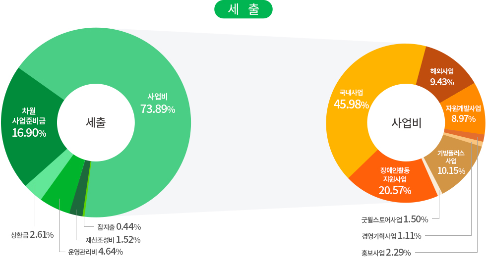 | 사업비 | 국내사업 | 국내아동결연 및 보육, 장애인의료 및 교육지원, 저소득가정지원, 다문화가족지원, 노인복지사업, 지역사회복지사업, 인식개선사업, 발달장애인작가양성지원사업, 발달장애인주간활동서비스, 장애인인식개선센터, 헬렌켈러지원센터 |