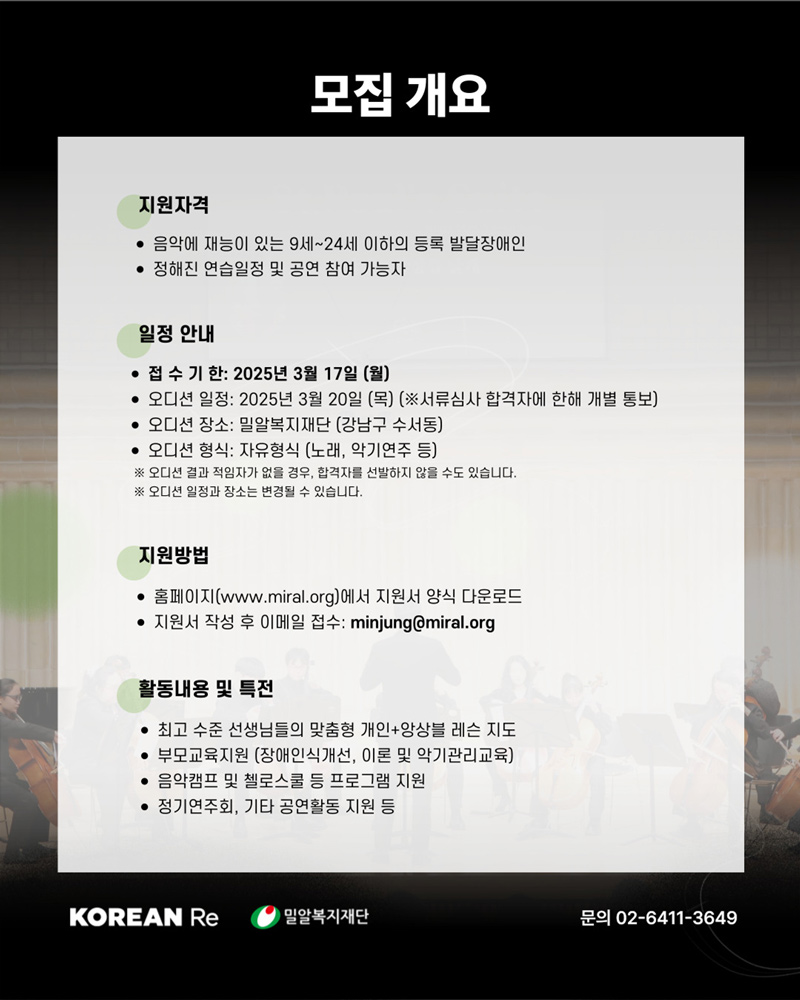 7. 문의: 밀알문화예술센터 김민정 과장(02-6411-3649)