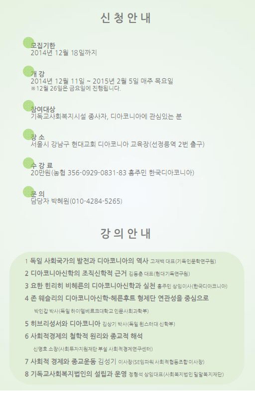 한국디아코니아 홍주민 상임이사, 우리재단 정형석 상임대표 등 8명의 전문 강사진과 함께 독일의 사회적 경제의 가장 중요한 축인 개신교 디아코니아를 깊이 있게 연구하여, 한국사회에 활발히 전개되고 있는 사회적 경제와 사회적 기업 그리고 협동조합운동이 개신교에게 주는 의미를 발견하고 이론을 넘어 적용가능한 실천현장을 만들어 나가려 합니다.