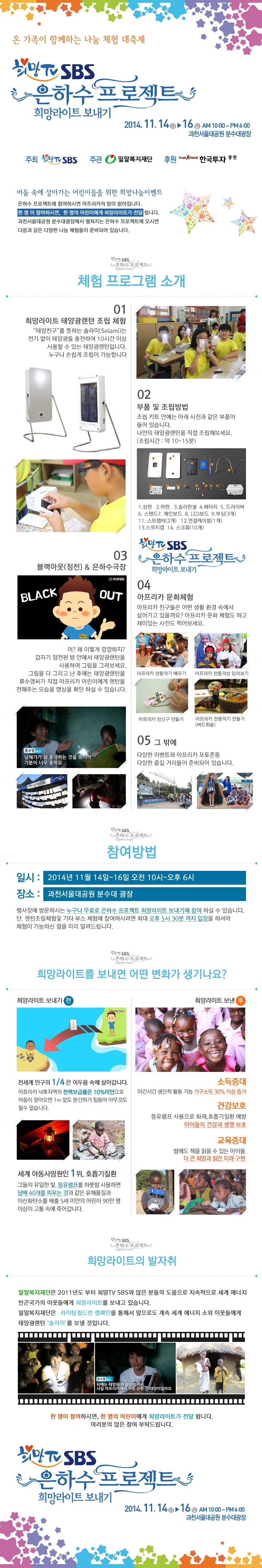우리재단은 오는 14일(금)부터 방영되는 희망TV SBS와 함께 서울대공원 분수대광장에서 ‘은하수 프로젝트 - 희망라이트 보내기’ 이벤트를 실시합니다. ‘은하수 프로젝트 - 희망라이트 보내기’ 이벤트는 전력보급율이 낮은 국가에 태양광 랜턴을 보내 희망의 빛을 전달하기 위해 진행되는 행사로, 에너지 교육을 비롯한 다양한 체험 프로그램으로 구성되어 있습니다. 여러분의 많은 관심과 참여를 부탁드립니다.