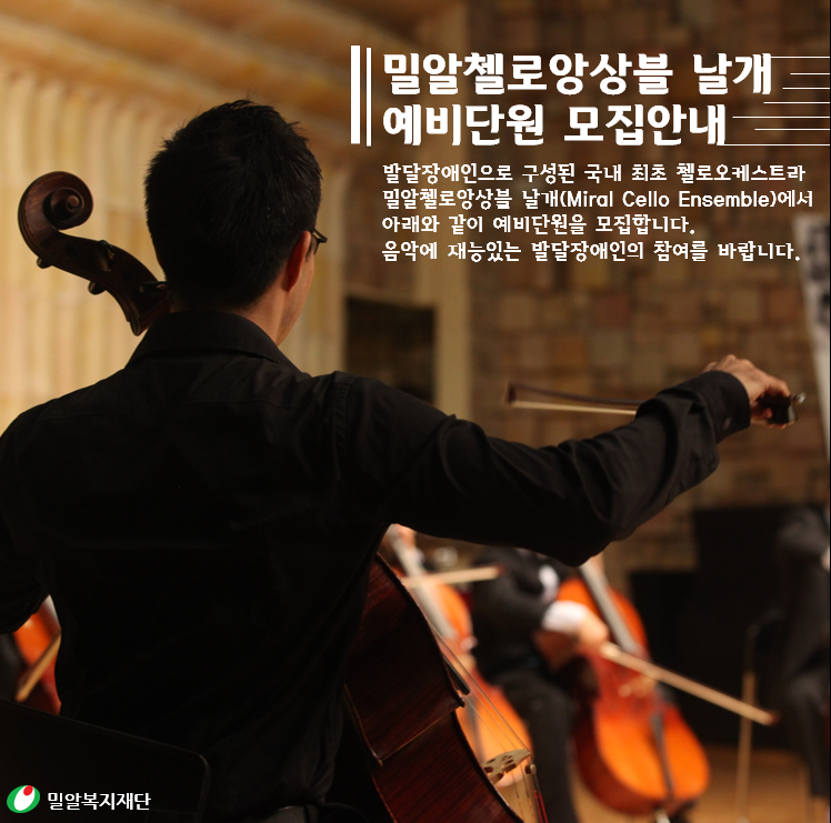 우리재단은 발달장애청소년 음악교육사업인 '밀알첼로앙상블 날개’ 예비단원을 모집하고자 합니다. 관심 있는 분들의 많은 신청과 응원을 부탁드립니다.