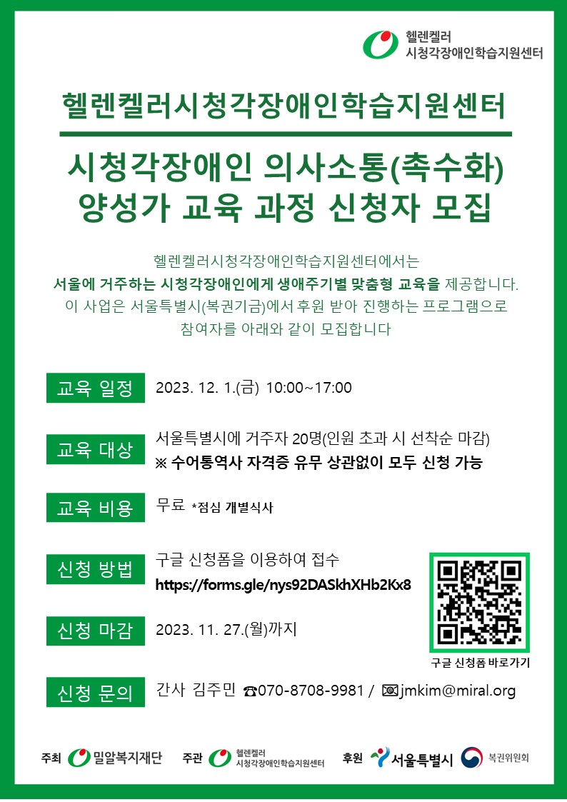 [마감] 2023 시청각장애인 의사소통(촉수화) 양성가 교육 과정 안내 (~11/27)