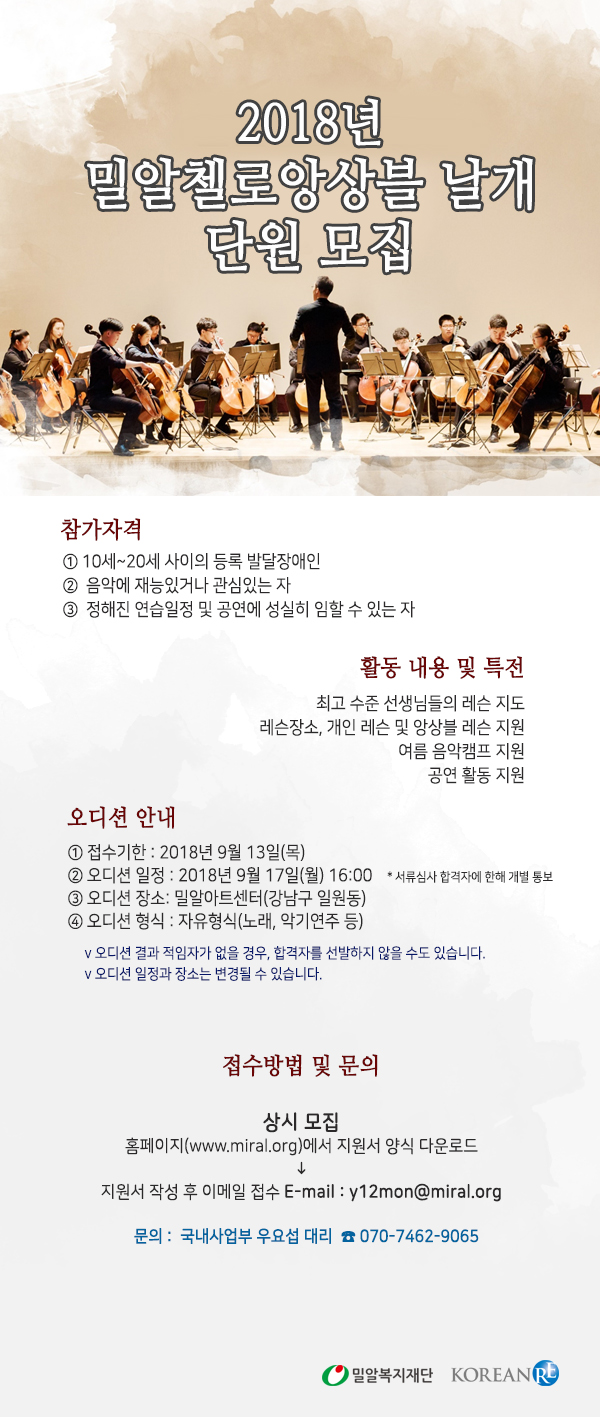 발달장애인으로 구성된 국내 최초 첼로 오케스트라 밀알첼로앙상블 날개(Miral Cello Ensemble)에서 아래와 같이 단원을 모집합니다.