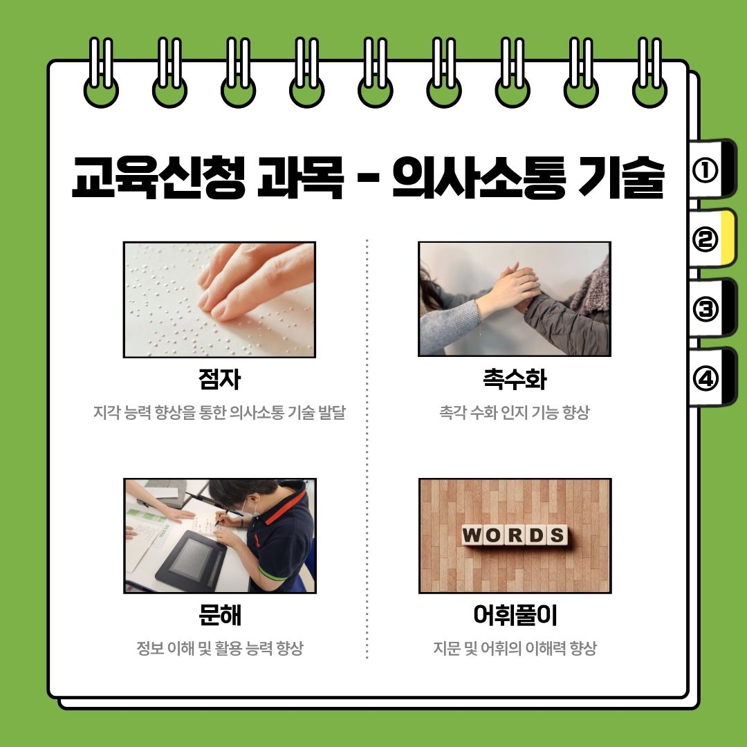 1. 의사소통기술: 점자, 촉수화, 고급수어, 국제수화, 문해, 어휘풀이