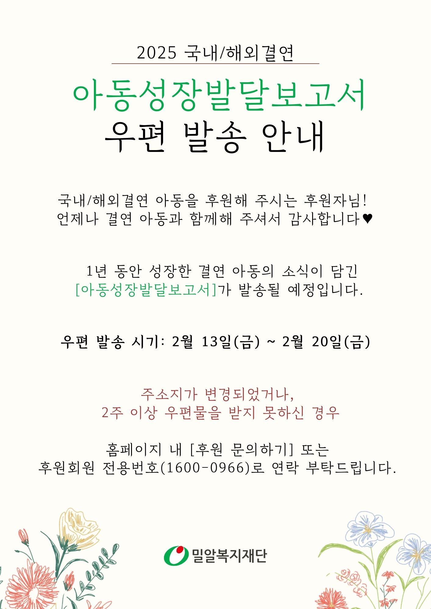 2025 국내/해외결연 아동성장발달보고서 우편 발송 안내