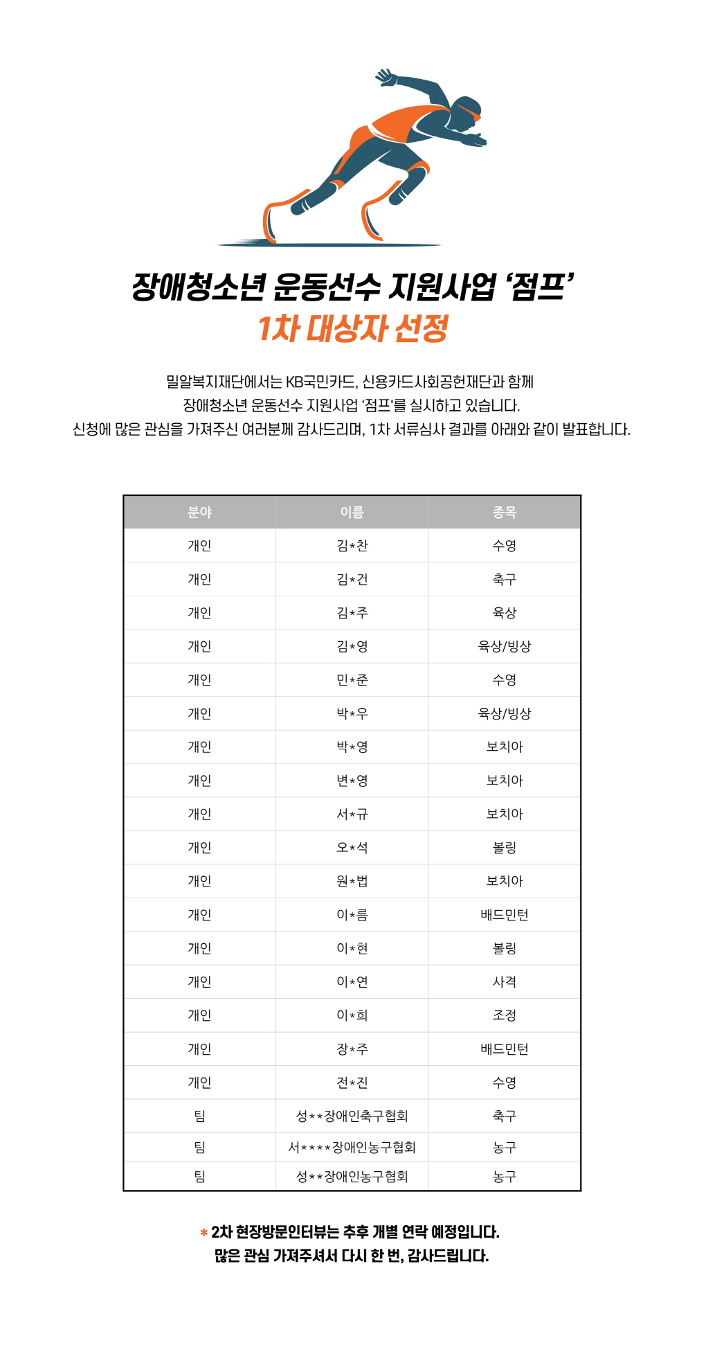 [발표] 장애청소년 운동선수 지원사업 '점프' 대상자 선정 (1차 서류심사 결과)