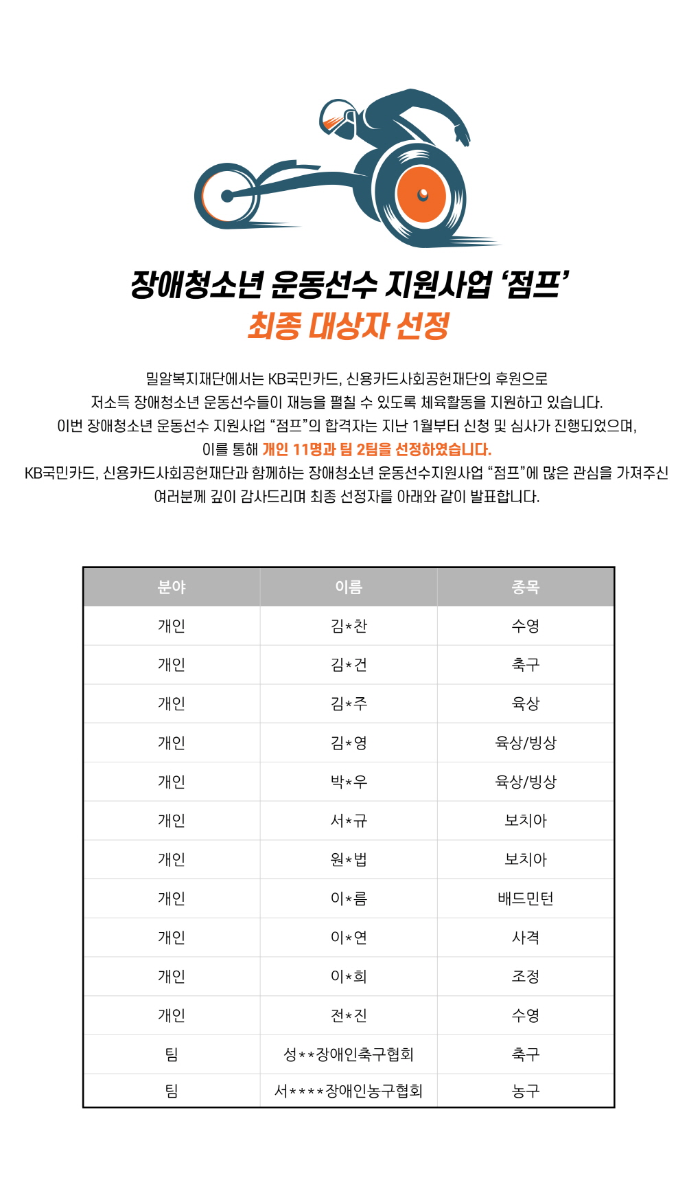 [발표] 장애청소년 운동선수 지원사업 '점프' 최종 대상자 선정 안내