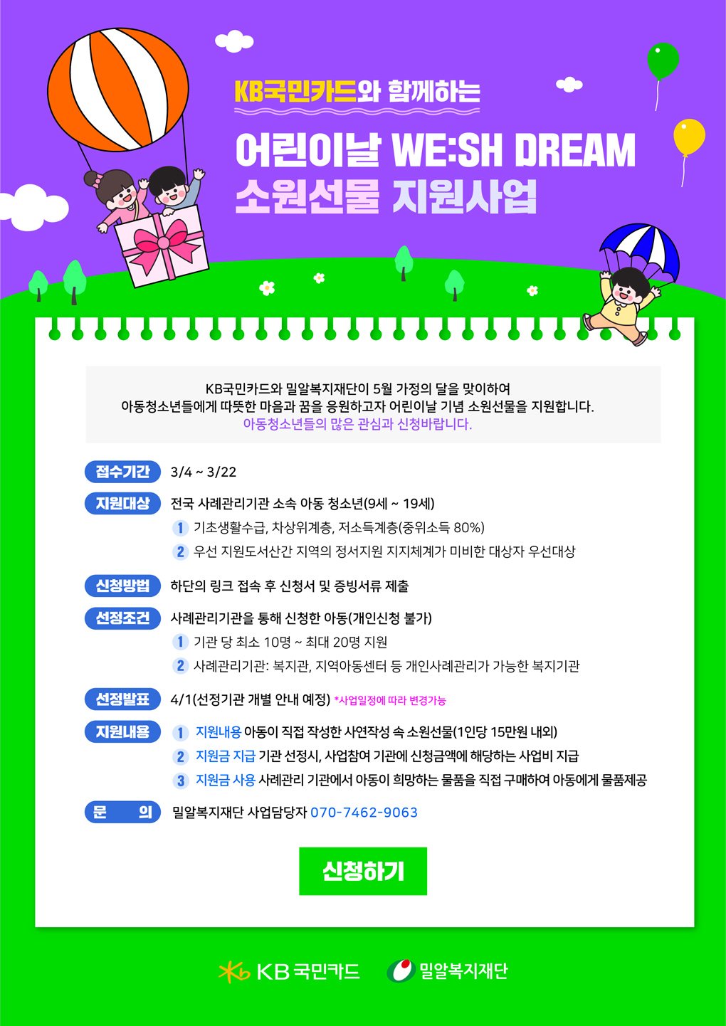 [마감] KB국민카드와 함께하는 WE:SH DREAM 소원선물 지원사업 참여기관 모집 (~3/22)
