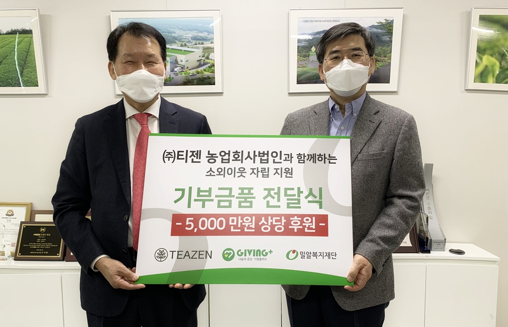 밀알복지재단(이사장 홍정길)은 기능성 차(茶) 전문브랜드인 ㈜티젠(대표 김종태, 이하 티젠)으로부터 5천만 원 상당의 기부금과 기부물품을 전달받았다고 26일(금) 밝혔다.