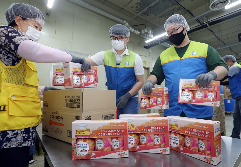 ▲13일 장애인 근로사업장인 굿윌스토어 밀알도봉점에서 발달장애인 직원들이 라이온코리아의 아이깨끗해 리미티드 에디션 제품 패키지를 포장하고 있다. (사진제공=라이온코리아)