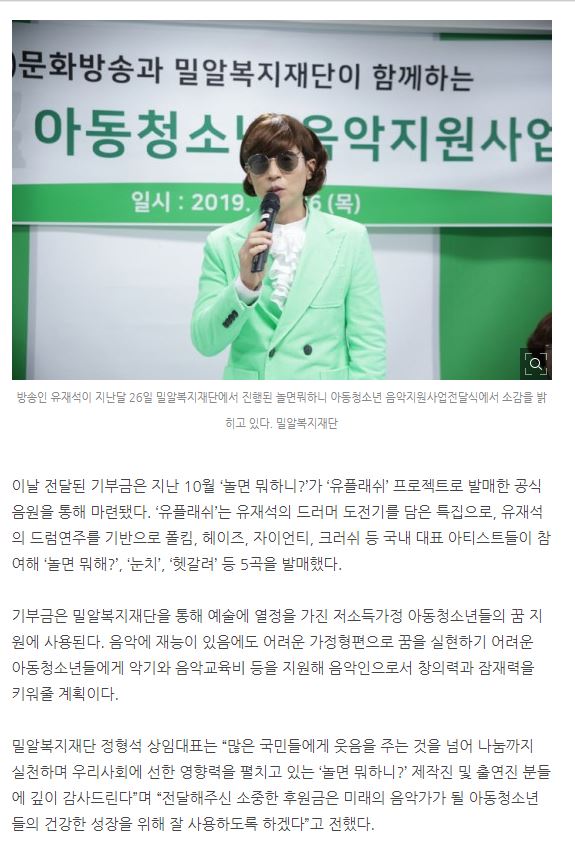 [서울경제] '놀면 뭐하니?' 유재석 드럼 연주 음원 수익금 2억원, 밀알복지재단에 기부