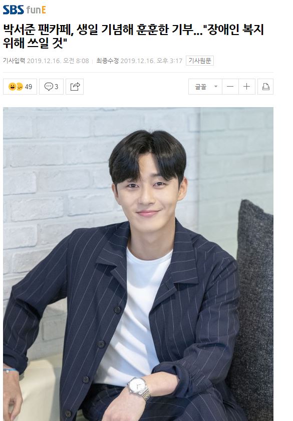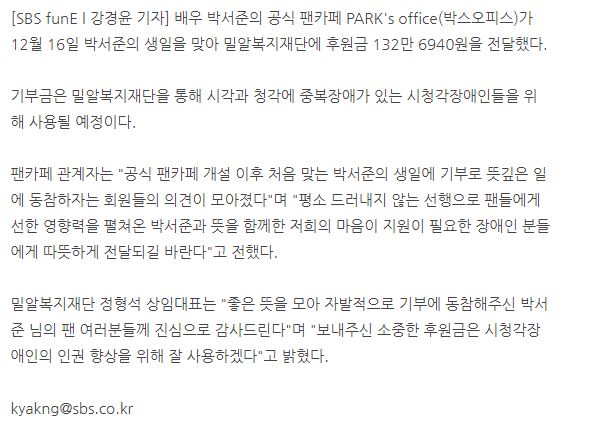 [SBS] 박서준 팬카페, 생일 기념해 훈훈한 기부..."장애인 복지 위해 쓰일것"