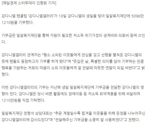 [한국경제] 강다니엘 팬클럽, 생일 맞아 밀알 복지재단에 5천만원 기부