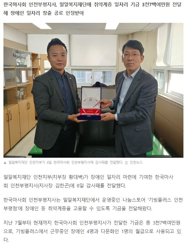 [경인매일] 밀알복지재단, 한국마사회 인천부평지사에 감사패 전달