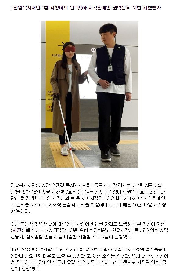 밀알복지재단 ‘흰 지팡이의 날’ 맞아 시각장애인 권익옹호 위한 체험행사
