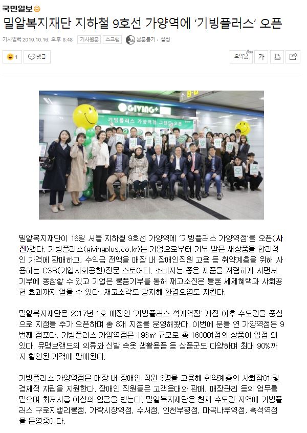 [국민일보] 밀알복지재단 지하철 9호선 가양역에 ‘기빙플러스’ 오픈